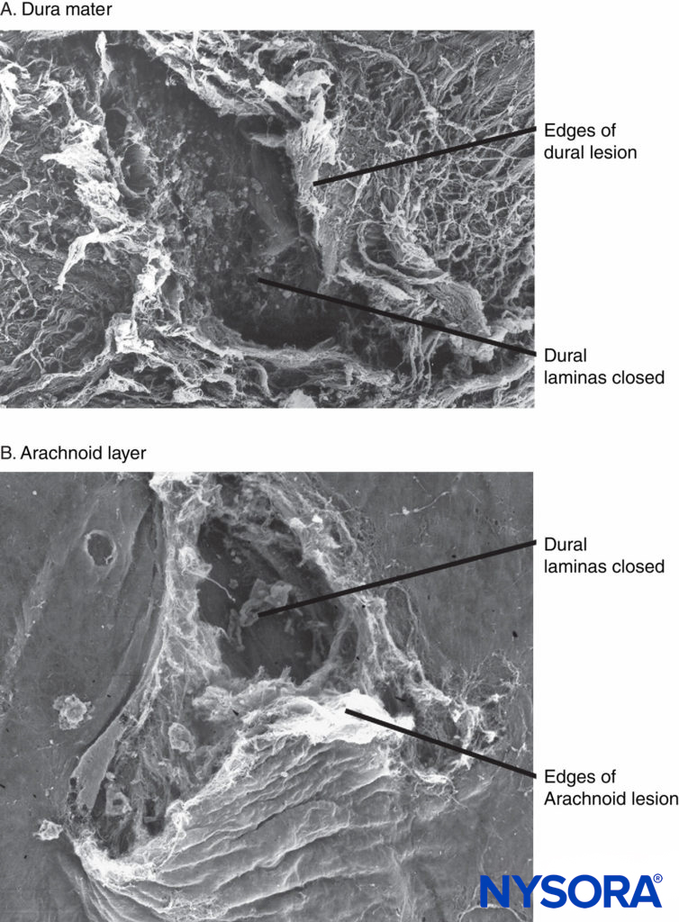 It has long been accepted that PDPH results from a disruption of normal CSF homeostasis. However, despite a great deal of research and observational data, the pathophysiology of PDPH remains incompletely understood. Cerebrospinal fluid is produced primarily in the choroid plexus at a rate of approximately 0.35 mL/min and reabsorbed through the arachnoid villa. The total CSF volume in adults is maintained around 150 mL, of which approximately half is extracranial, and gives rise to normal lumbar opening pressures of 5–15 cm H2O in the horizontal position (40–50 cm H2O in the upright position). It has been shown experimentally that the loss of approximately 10% of total CSF volume predictably results i the development of typical PDPH symptoms, which resolve promptly with reconstitution of this deficit. It is generally agreed that PDPH is due to the loss of CSF through a persistent leak in the meninges. In this regard, it has been postulated that the cellular arachnoid mater (containing frequent tight junctions and occluding junctions) is perhaps more important than the more permeable and acellular dura mater in the generation of symptoms. In fresh cadavers, Reina et al studied lesions of the human dural sac produced by different spinal needles and different bevel orientations. The dura mater has a thickness around 400 μm, and it is formed by randomly distributed fibers, arranged around 80 concentric layers, known as dural laminas, while the arachnoid layer has a thickness around 40 μm1 (Figure 2).