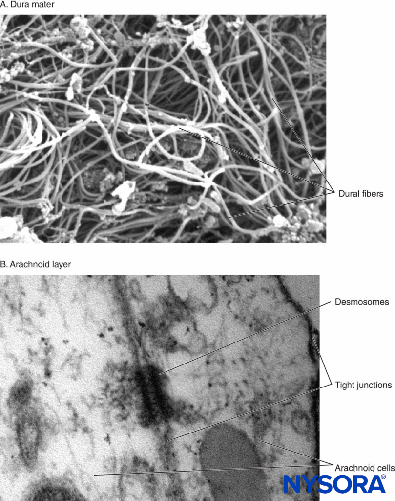 FIGURE 2. A: Human spinal dura mater. Collagen fibers in a random direction. Scanning electron microscopy. Magnification x6500. Reproduced with permission from Dittmann M, Reina MA, López García A: New results in the visualization of the spinal dura mater with scanning electron microscopy. Anaesthesist. 1998 May;47(5):409-413. B: Human spinal arachnoid layer. Arachnoid cells. Transmission electron microscopy. Magnification x150000. Reproduced with permission from Reina MA1, Prats-Galino A, Sola RG, et al: Structure of the arachnoid layer of the human spinal meninges: a barrier that regulates dural sac permeability. Rev Esp Anestesiol Reanim. 2010 Oct;57(8):486–492.