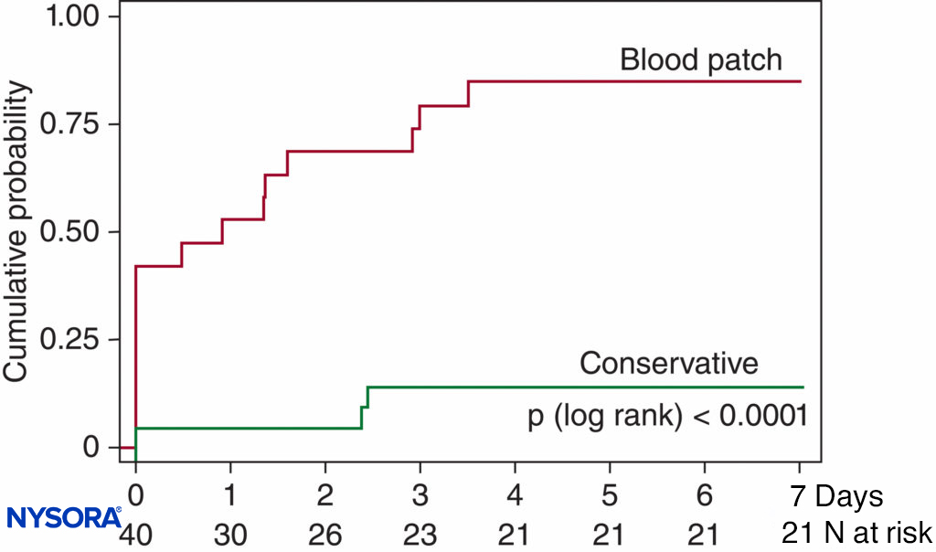 FIGURE 9. Cumulative probability of recovery from PDPH. Recovery from moderate-to-severe PDPH after diagnostic LP in 40 patients. At 7 days, only 3 of 21 conservatively treated patients had fully recovered (no headache symptoms) versus 16 of 19 patients treated with EBP (p < .0001). (Reproduced with permission from van Kooten F, Oedit R, Bakker SL, et al: Epidural blood patch in post-dural puncture headache: a randomized, observer-blind, controlled clinical trial. Neurol Neurosurg Psychiatry. 2008 May;79(5):553–558.)