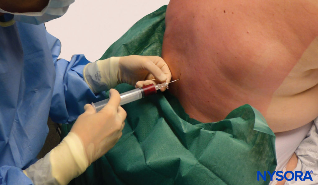 FIGURE 10. Blood patch. Administration of an epidural blood patch using 20 mL of freshly drawn blood. The blood is injected until 20 mL are reached or the patient perceives significant pain or pressure in the back, whichever comes first.