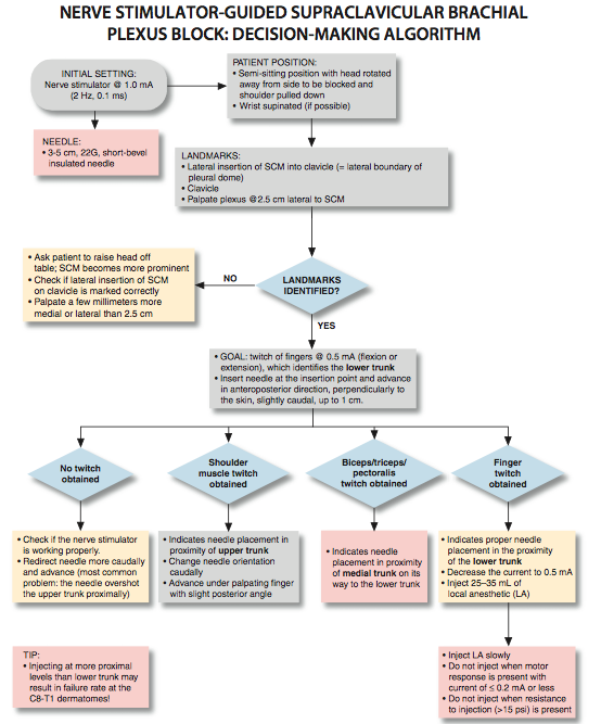 Once the elicited motor response of the fingers is obtained at 0.5 mA, the injection is carried out after gentle aspiration. Injecting in the proximity of the lower trunk (motor response of the fingers) is the most important factor in accomplishing a successful supraclavicular brachial plexus block. For surgical anesthesia, we commonly select 25 to 35 mL of 1.5% mepivacaine with 1:300,000 epinephrine, for a 3- to 4-hour duration of anesthesia and a variable, but usually short, duration of analgesia. We use a similar volume of 3% 2-chloroprocaine for a duration of 60 to 90 minutes of anesthesia for shorter cases. For analgesia, 20 mL of 0.2% ropivacaine with 1:300,000 epinephrine as an intravascular marker can be selected. Troubleshooting Maneuvers