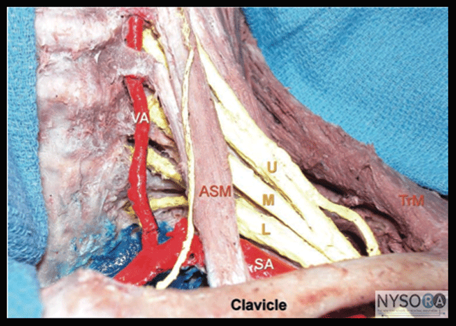 Supraclavicular Block General Considerations The supraclavicular approach to the brachial plexus characteristically is associated with a rapid onset of anesthesia and a high success rate. The first percutaneous supraclavicular block was performed by Kulenkampff in Germany in 1911, reportedly on himself. A few months after, Hirschel described a method of brachial plexus with an axillary approach. In 1928, Kulenkampff and Persky published their experiences with a thousand blocks without apparent major complications. Kulenkampff's technique required the patient to be in the sitting position. The needle insertion was above the midpoint of the clavicle in the direction of the spinous process of T2 or T3. Unfortunately, this medial orientation of the needle was associated with a risk of pneumothorax, which eventually became the reason for the supraclavicular block to fall into disfavor in many centers. Since then, many modifications to the original technique were proposed to decrease the risk for pneumothorax. The technique described in this chapter takes into account the location of the dome of the pleura to reduce the risk for pneumothorax. The advantages of a supraclavicular technique over other brachial plexus block approaches are its rapid onset and complete and predictable anesthesia for entire upper extremity and particularly, hand surgery. The introduction of ultrasound guidance to regional anesthesia in the last decade has resulted in significant renewed interest in the clinical application of the supraclavicular block, as well as a greater understanding of its mechanics. Functional Anatomy The supraclavicular block is often called the "spinal anesthesia of the upper extremity" because of its ubiquitous application for upper extremity surgery. The reasons for its high success rate are in its anatomic characteristics. The block is performed at the level of the distal trunks and origin of the divisions, where the brachial plexus is confined to its smallest surface area (Figure 2A). The three trunks carry the entire sensory, motor, and sympathetic innervation of the upper extremity, with the exception of the uppermost part of the medial side of the arm (T2). The densely packed divisions, in contrast, carry a similar amount of innervation in a slightly larger surface area, but there is a larger surface of absorption. Another important anatomic feature of the supraclavicular block is the presence of the subclavian artery in front of the lower trunk and its divisions (Figure 2B). To increase the chance of blocking C8-T1 dermatomes it may be eneficial to insert the needle in the proximity of the lower trunk and make it the focal point of injection. The sternocleidomastoid muscle inserts on the medial third of the clavicle, the trapezius inserts on the lateral third, and the neurovascular bundle passes underneath the middle third, which includes the midpoint of the clavicle. During a supraclavicular block, the pleura potentially can be breached either at the pleural dome (more likely) or through the first intercostal space. A practical knowledge of the anatomical position of the pleura is important to decrease the risk of pneumothorax. The pleural dome is contained within the concavity of the first rib. Because the first rib crosses under the junction between the medial and middle thirds of the clavicle (Figure 3), its path coincides with the insertion of the sternocleidomastoid muscle, which inserts on the medial third of the clavicle. Therefore, the lateral insertion of the sternocleidomastoid muscle on the clavicle can be used as a landmark for the location of the first rib and of the lateral edge of the dome of the pleura. The first intercostal space, in contrast, is for the most part infraclavicular, and consequently it should not be reached during a supraclavicular block.
