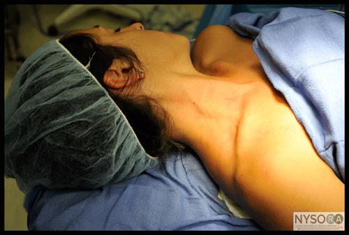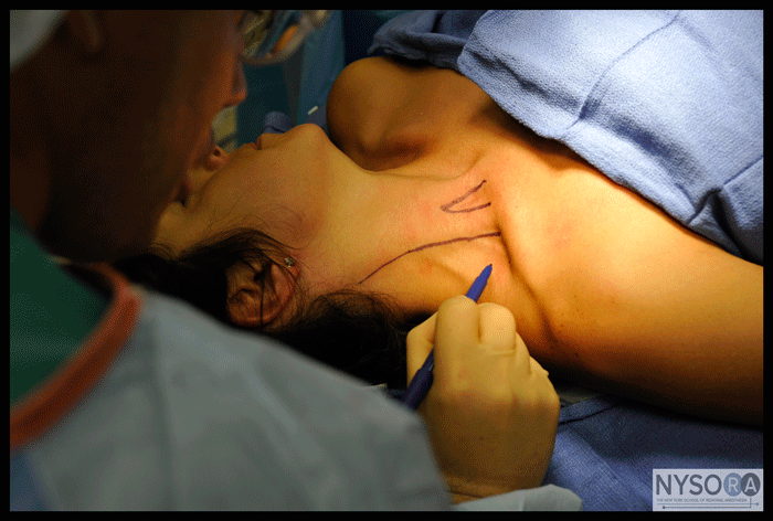 Maneuvers to Facilitate Landmark Identification To facilitate the recognition of the sternocleidomastoid muscle, the patient can be asked to elevate the head off the pillow, as shown in Figure 5. Once the sternocleidomastoid is identified, a mark is placed on the clavicle at its lateral insertion, as shown in Figure 6.