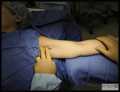 Figure 5:Patient position for the axillary brachial plexus block. Technique After thorough skin preparation, the pulse of the axillary artery is palpated high in the axilla, Figure 6. Once the pulse is felt, the artery is fixed between the index and the middle fingers and firmly pressed against the humerus to prevent "rolling" of the axillary artery during block performance. At this point, movement of the palpating hand and the patient's arm should be minimized because the axillary artery is highly movable in the adipose tissue of the axillary fossa. The anesthesiologist should assume a sitting position by the patient's side to avoid strain and unwanted hand movement during block performance. The index and middle fingers of the palpating hand should be pressed firmly against the arm, straddling the pulse of the axillary artery immediately distal to the insertion of the pectoralis major muscle (Figure 6). This maneuver shortens the distance between the needle insertion site and the brachial plexus block by compressing the subcutaneous tissue. It also helps in stabilizing the position of the artery and needle during performance of the block. The palpating hand should not be moved during the entire procedure to allow for precise redirection of the angle of needle insertion when necessary. Local anesthetic is infiltrated subcutaneously at the determined needle insertion site. Axillary brachial plexus blocks can also be accomplished using multiple injections after electrolocation of each nerve. Several studies have documented faster onset and better success rate compared with the single-injection technique. Multiple injections are possible due to the shallow and relatively predictable location of the nerves. With this technique, the mental image of the position the nerves in relationship to the artery should be kept in mind, Figure 3.