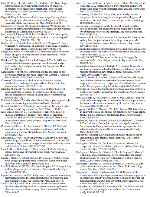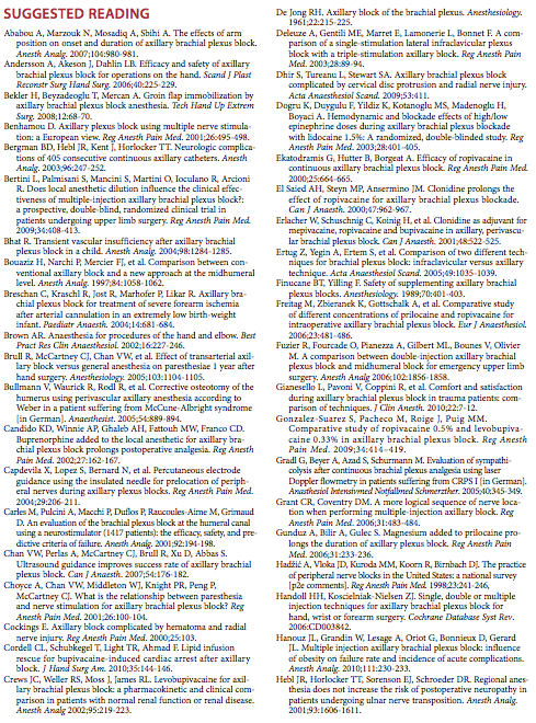 General Considerations The axillary brachial plexus block was first described by Halsted in 1884 at the Roosevelt Hospital in New York City. The axillary brachial plexus block is one of the most commonly used regional anesthesia techniques. The proximity of the terminal nerves of the brachial plexus to the axillary artery makes identification of the landmarks consistent (axillary artery) equally for both the nerve stimulator and surface based ultrasound-guided techniques. The axillary block is an excellent choice of anesthesia technique for elbow, forearm, and hand surgery. Functional Anatomy By the time the brachial plexus passes behind the lower bor- der of the pectoralis minor muscle in the axilla, the cords quickly begin to form the principal terminal nerves of the brachial plexus, namely, the median, ulnar, radial, and musculocutaneous nerves (Figure 2). The arrangement of the individual nerves and their relationship to the axillary artery is important in axillary blockade (Figure 3). With the arm abducted at 90° and the axillary arterial pulsation as a point of reference, the nerves are located as follows: The median nerve is positioned superficially and immediately above the pulse; the ulnar nerve is found superficial slightly deeper than the median nerve; the radial nerve is located behind the pulse. The musculocutaneous nerve can be found 1 to 3 cm deeper and above the pulse, often outside the brachial plexus sheath as it moves distally away from the axillary fossa.