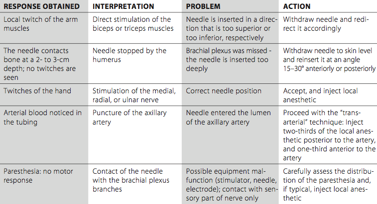 Troubleshooting Some common responses to nerve stimulation and the course of action to obtain the proper response are shown in Table 1. Block Dynamics and Perioperative Management An axillary brachial plexus block is associated with relatively minor patient discomfort at the time of placement. However, some patients complain of the sensation of soreness in the axillary region after the block resolution, which may be related the intramuscular needle insertion or hematoma formation from inadvertent vascular puncture. Intravenous midazolam 1 to 2 mg with alfentanil 250 to 500 µg at the time of needle insertion should produce a comfortable, cooperative patient during nerve localization. The onset time for this block ranges between 15 and 25 minutes. The first sign of the blockade is loss of coordination of the arm and forearm muscles. This sign is usually seen sooner than the onset of a sensory or temperature change. When this sign is observed shortly after injection, it is highly predictive of an oncoming successful brachial plexus blockade. Table 1: Some Common Responses to Nerve Stimulation and the Course of Action for Proper Response