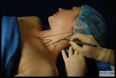 To estimate the line of needle insertion overlying the transverse processes, the mastoid process and the transverse process of C6 are identified and marked. The latter is easily palpated behind the clavicular head of the sternocleidomastoid muscle just below the level of the cricoid cartilage. Next, a line is drawn connecting the mastoid process to the C6 transverse process. The palpating hand is best positioned just behind the posterior border of the sternocleidomastoid muscle. Once this line is drawn, the insertion sites over C2 through C4 are labeled as follows: C2: 2 cm caudad to the mastoid process, C3: 4 cm caudad to the mastoid process, and C4: 6 cm caudad to the mastoid process (Figure 10).