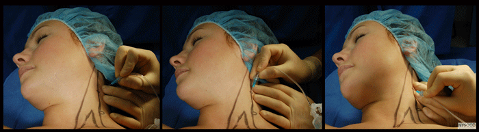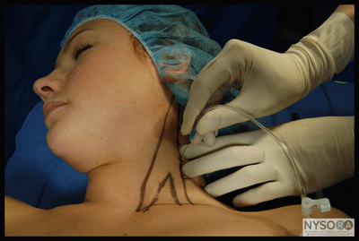Figure 7: Injection of local anesthetic for superficial cervical plexus. The injection is made fan-wise behind the posterior border of the sternocleidomastoid muscle at a depth of approximately 1 cm in average-size patients. Technique After cleaning the skin with an antiseptic solution, the needle is inserted along the posterior border of the sternocleidomastoid, and three injections of 5 mL of local anesthetic are injected behind the posterior border of the sternocleidomastoid muscle subcutaneously, perpendicularly, cephalad, and caudad in a 'fan' fashion (Figure 7). |
