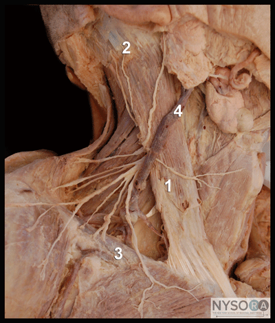 Figure 3: Anatomy of the superficial cervical plexus. (1) Sternocleidomastoid muscle (2) mastoid process (3) clavicle (4) external jugular vein. The cervical plexus is formed by the anterior rami of the four upper cervical nerves. The plexus lies just lateral to the tips of the transverse processes in the plane just behind the sternocleidomastoid muscle, giving off both cutaneous and muscular branches. There are four cutaneous branches, all of which are innervated by roots C2-4. These emerge from the posterior border of the sternocleidomastoid muscle at approximately its midpoint, and they supply the skin of the anterolateral neck (Figures 2 and 3). The second, third, and fourth cervical nerves typically send a branch each to the spinal accessory nerve or directly into the deep surface of the trapezius to supply sensory fibers to this muscle. In addition, the fourth cervical nerve may send a branch downward to join the fifth cervical nerve and participates in formation of the brachial plexus. The motor component of the cervical plexus consists of the looped ansa cervicalis (C1-C3), from which the nerves to the anterior neck muscles originate, and various branches from individual roots to posterolateral neck musculature (Figure 4). The C1 spinal nerve (the suboccipital nerve) is strictly a motor nerve, and is not blocked with either tech- nique. One other significant muscle innervated by roots of the cervical plexus includes the diaphragm (phrenic nerve, C3,4,5) (Table 1). Table 1: Cervical Plexus Branches ![]() Distribution of Blockade Cutaneous innervation of both the deep and the superficial cervical plexus blocks includes the skin of the anterolateral neck and the ante- and retroauricular areas (Figure 5). In addition, the deep cervical block anesthetizes three of the four strap muscles of the neck, geniohyoid, the prevertebral muscles, sternocleidomastoid, levator scapulae, the scalenes, trapezius, and the diaphragm (via blockade of the phrenic nerve).