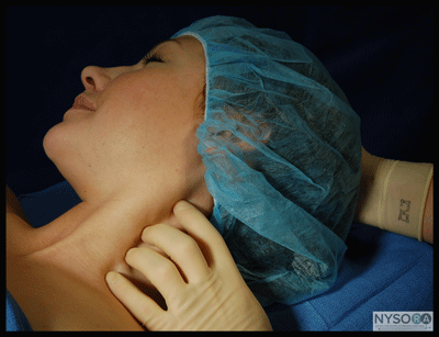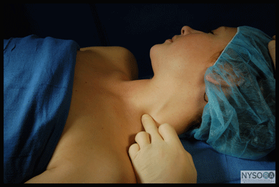 Figure 9: Palpation technique to determine the posterior border of the sternocleidomastoid muscle. With the head of the patient rotated away from the palpation side, the patient is asked to lift his or her head off of the bed to accentuate the sternocleidomastoid muscle. |