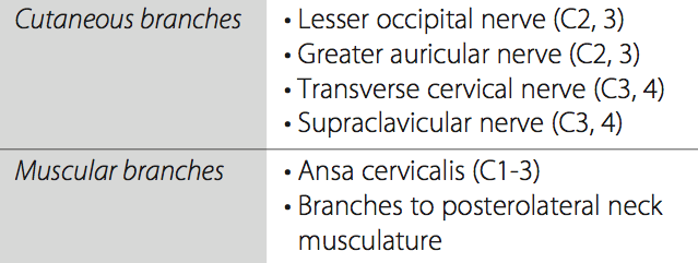 General Considerations Cervical plexus block can be performed using two different methods. One is a deep cervical plexus block, which is essentially a paravertebral block of the C2-4 spinal nerves (roots) as they emerge from the foramina of their respective vertebrae. The other method is a superficial cervical plexus block, which is a subcutaneous blockade of the distinct nerves of the anterolateral neck. The most common clinical uses for this block are carotid endarterectomy and excision of cervical lymph nodes. The cervical plexus is anesthetized also when a large volume of local anesthetic is used for an interscalene brachial plexus block. This is because local anesthetic invariably escapes the interscalane groove and layers out underneath the deep cervical fascia where the branches of the cervical plexus are located. The sensory distribution for the deep and superficial blocks is similar for neck surgery, so there is a trend toward favoring the superficial approach. This is because of the potentially greater risk for complications associated with the deep block, such as vertebral artery puncture, systemic toxicity, nerve root injury, and neuraxial spread of local anesthetic. Functional Anatomy