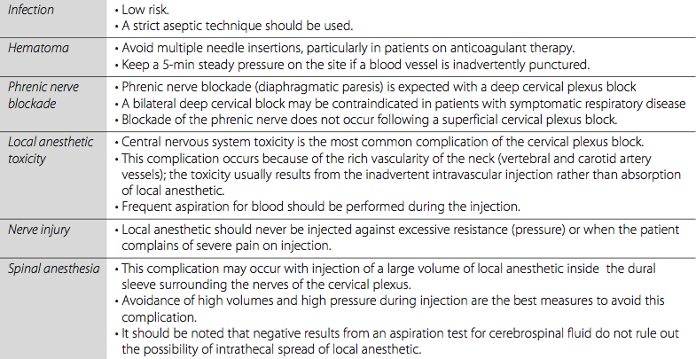 Premedication is useful for patient comfort; however, excessive sedation should be avoided. During neck surgery, airway management can be difficult because the anesthesiologist must share access to the head and neck with the surgeon. Surgeries like carotid endarterectomy require the patient to be fully conscious, oriented, and cooperative during the entire procedure. In addition, excessive sedation and the consequent lack of patient cooperation can result in restlessness and create difficulty for the surgeon. The onset time for this block is 10 to 20 minutes. The first sign is decreased sensation in the area of distribution of the respective components of the cervical plexus. Complications of cervical plexus blocks and strategies to avoid them are listed in Table 2.