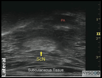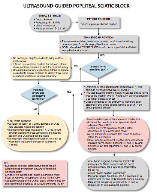 General Considerations Performance of a sciatic block above the popliteal fossa benefits from ultrasound guidance in several ways. The anatomy of the sciatic nerve as it approaches the popliteal fossa can be variable, and the division into the tibial nerve (TN) and common peroneal nerve (CPN) occurs at a variable distance from the crease. Knowledge of the location of the TPN and CPN in relation to each other is beneficial in ensuring the anesthesia of both divisions of the sciatic nerve. Moreover, with nerve stimulator-based techniques, larger volumes (e.g., >40 mL) of local anesthetic often are required to increase the chance of block success and rapid onset. A reduction in local anesthetic volume can be achieved with ultrasound guidance because the injection can be halted once adequate spread is documented. The two approaches to the popliteal sciatic block common in our practice are the lateral approach with patient in supine (more commonly, oblique position) and the posterior approach (Figure 2). It should be noted that with the lateral approach, the resulting ultrasound image is identical to the image in the posterior approach. Both are discussed in this chapter. Only the patient position and needle path differ between the two approaches; the rest of the technique details are essentially the same. Ultrasound Anatomy With the posterior and the lateral approaches, the transducer position is identical; thus the sonographic anatomy appears the same. However, note that although the image appears the same, there is a 180° difference in patient orientation. Beginning with the transducer in the transverse position at the popliteal crease, the popliteal artery is identified, aided with the color Doppler ultrasound when necessary, at a depth of approximately 3 to 4 cm. The popliteal vein accompanies the artery. On either side of the artery are the biceps femoris muscles (lateral) and the semimembranosus and semitendinosus muscles (medial). Superficial (i.e., toward the skin surface) and lateral to the artery is the tibial nerve, seen as a hyperechoic, oval, or round structure with a stippled or honeycomb pattern on the interior (Figure 3A and B). If difficulty in identifying the nerve is encountered, the patient can be asked to dorsiflex and plantar flex the ankle, which makes the nerve rotate or move in relation to its surroundings. Once the tibial nerve is identified, an attempt can be made to visualize the common peroneal nerve, which is located even more superficial and lateral to the tibial nerve. The transducer should be slid proximally until the tibial and peroneal nerves are visualized coming together to form the sciatic nerve before its division. (Figure 4A and B). This junction usually occurs at a distance between 5 and 10 cm from the popliteal crease but this may occur very close to the crease or (less commonly) more proximally in the thigh. As the transducer is moved proximally, the popliteal vessels move anteriorly (i.e., deeper) and therefore become less visible. Adjustments in depth, gain, and direction of the ultrasound beam should be made to keep the nerve visible at all times. The sciatic nerve typically is visualized at a depth of 2 to 4 cm.