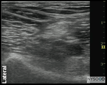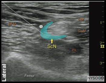 Figure 8: Simulated needle path and local anesthetic distribution to block the sciatic nerve in the popliteal fossa using the lateral approach. Posterior Approach Landmarks and Patient Positioning This block is performed with the patient in the prone or oblique position with the legs slightly abducted. A small footrest is useful to facilitate identification of a motor response if nerve stimulation is used. Also, it relaxes the hamstring tendons, making transducer placement and manipulation easier. Technique With the patient in the proper position, the skin is disinfected and the transducer positioned to identify the sciatic nerve (Figure 2). Similar maneuvers as described for the lateral approach can be made to better visualize the nerve. Once identified, a skin wheal is made immediately lateral or medial to the transducer. Then the needle is inserted in plane and advanced toward the sciatic nerve (Figures 9 and 10). If nerve stimulation is used (0.5 mA, 0.1 msec), the contact of the needle tip with the sciatic nerve often is associated with a motor response of the calf or foot. Once the needle tip is confirmed to be adjacent to the nerve, the syringe is gently aspirated and the local anesthetic deposited. Needle repositioning and injection of smaller aliquots is frequently required to ensure adequate circumferential spread of the local anesthetic (Figure 11).