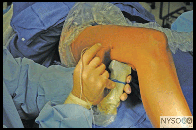 Lateral Approach Landmarks and Patient Positioning This block is performed with the patient in the supine or oblique (more convenient) position. Sufficient space must be made to accommodate the transducer beneath the knee and thigh.This can be accomplished either by resting the foot on an elevated footrest or flexing the knee while an assistant stabilizes the foot and ankle on the bed (Figure 5). If nerve stimulation is used at the same time, exposure of the calf and foot are required to observe motor responses.