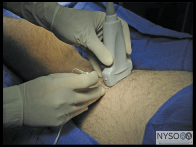 Figure 12: Continuous sciatic block in the popliteal fossa using a lateral approach with patient in the supine position. The needle is positioned within the epineural sheath of the sciatic nerve. After an injection of a small volume of local anesthetic to confirm the needle position a catheter is inserted 2-4 cm past the needle tip. Pre-loading the catheter is useful in facilitating the procedure.. The catheter is secured by either taping it to the skin or tunneling. There is no agreement among clinicians regarding what constitutes the ideal catheter securing system. Some clinicians prefer one method over the other. However, the decision regarding which method to use could be based on the patient's age, duration of the catheter therapy, and anatomy. The lateral approach may have some advantage over the prone approach with regard to catheter placement. First, the biceps femoris muscle tends to stabilize the catheter and decrease the chance of dislodgment, compared with the subcutaneous tissue of the popliteal fossa in the prone approach. Second, if the knee is to be flexed and extended, the side of the thigh is less mobile than the back of the knee. Finally, access to the catheter site is more convenient with the lateral approach compared with the prone approach. A commonly suggested starting infusion regimen is to infuse ropivacaine 0.2% at 5 mL/hour with a patient-delivered bolus of 5 mL every 60 minutes. ![]() |