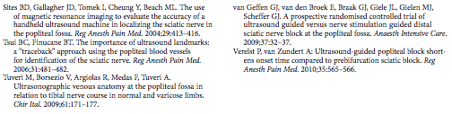 Figure 6: Sonoanatomy of the popliteal fossa imaged with the transducer positioned as in Figure 5. The image appears inverted compared to the image in the lateral/ oblique position. Sciatic nerve block results in anesthesia of the entire lower limb below the knee, both motor and sensory, with the exception of a variable strip of skin on the medial leg and foot, which is the territory of the saphenous nerve, a branch of the femoral nerve. The motor fibers to the hamstring muscles are spared; however, sensory fibers to the posterior aspect of the knee are still blocked. For a more comprehensive review of the sciatic nerve distribution. Equipment A standard regional anesthesia tray is prepared with the following equipment: