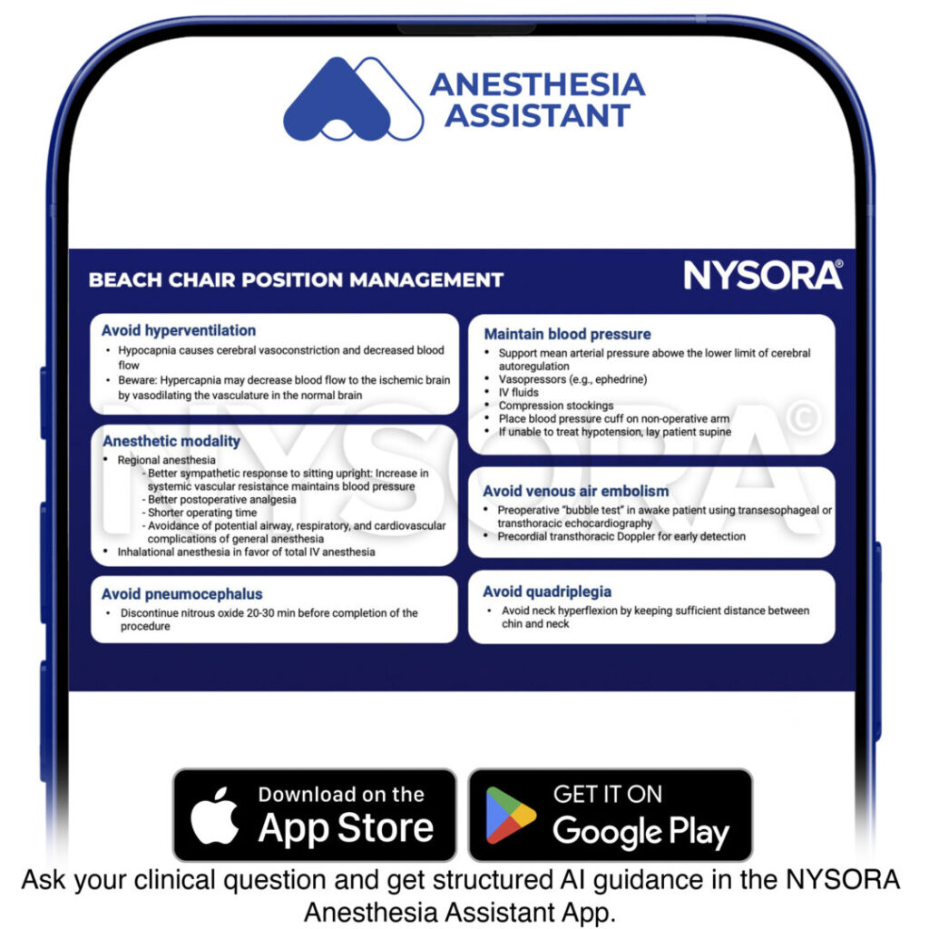 Management of patients presenting for surgery in the beach chair position comprises minimizing the risk of complications, mainly by maintaining cerebral perfusion.