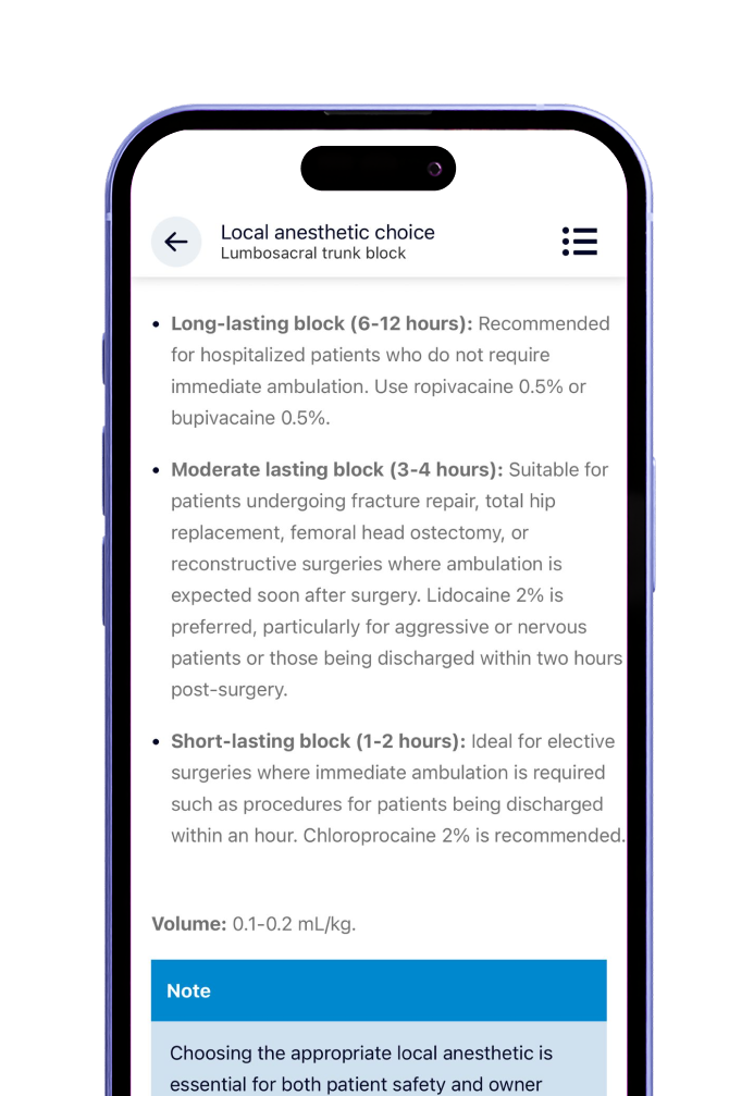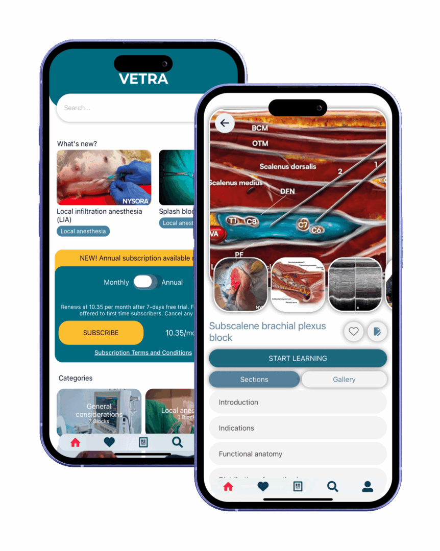 The NYSORA VetRA App provides quick, on-the-go access to expertly-curated techniques, helping you: