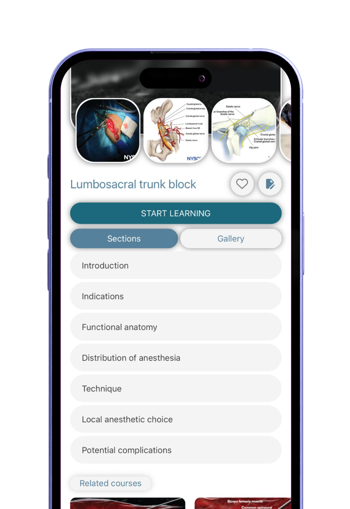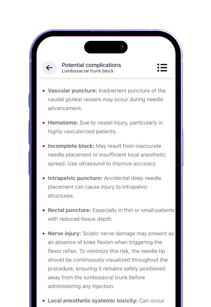 The app uses NYSORA’s highly standardized method. It walks you through specific, reproducible steps designed to simplify and unify your approach to nerve blocks, ensuring consistent and successful outcomes. Each technique follows the same structured format, including: