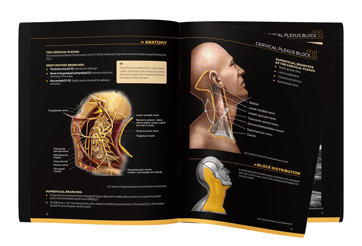 Detailed functional and ultrasound anatomy with the distribution of each specific nerve block.