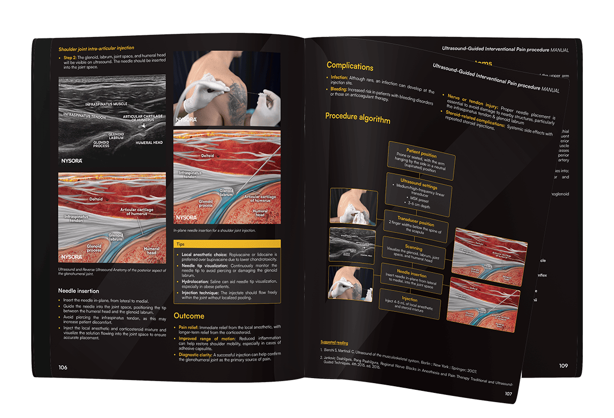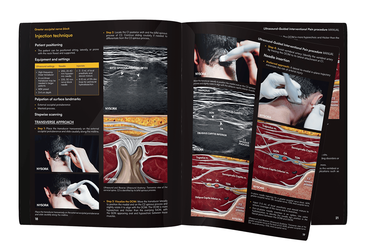 The Ultrasound-Guided Interventional Pain Procedures Manual by NYSORA is a comprehensive, step-by-step guide covering pain procedures across all anatomical regions.