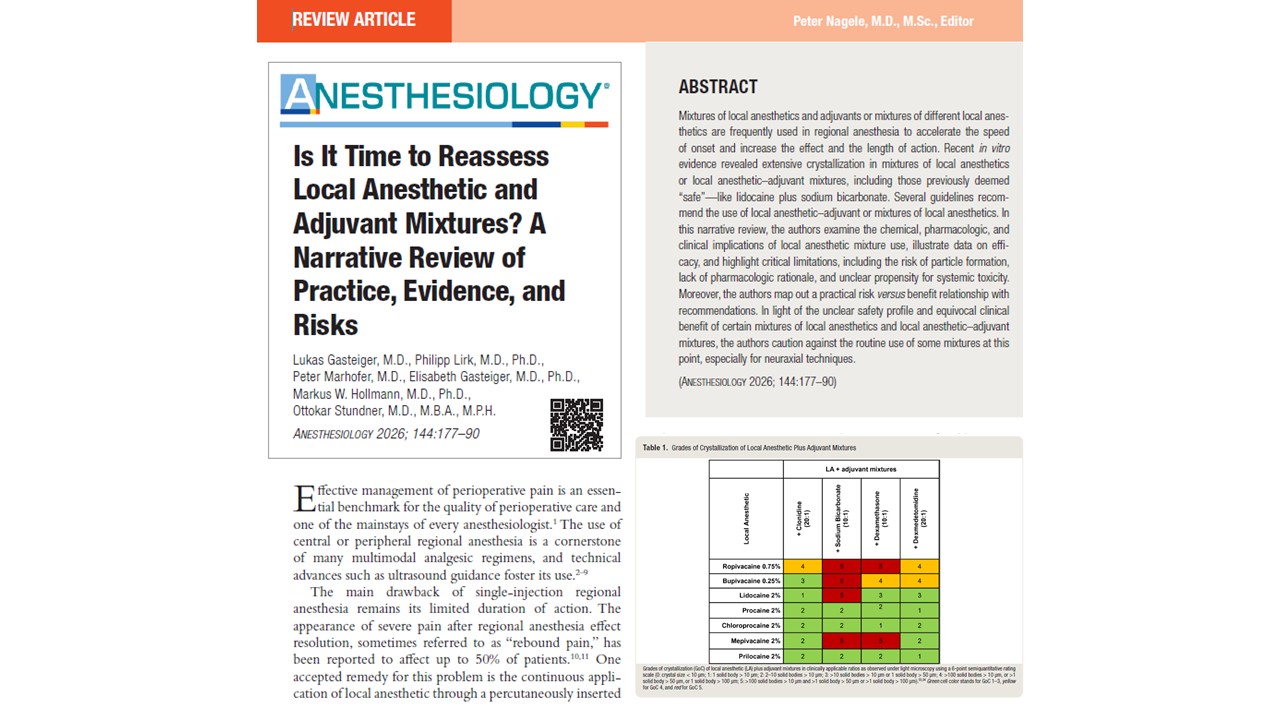 Gasteiger L, Lirk P, Marhofer P, Gasteiger E, Hollmann MW, Stundner O. Is It Time to Reassess Local Anesthetic and Adjuvant Mixtures? A Narrative Review of Practice, Evidence, and Risks. Anesthesiology. 2026 Jan 1;144(1):177-190.