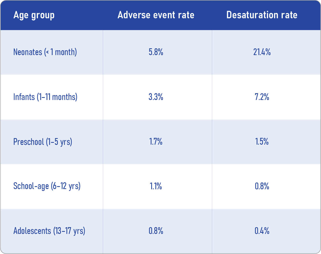 - Neonates: 5.8% experienced adverse events; 21.4% had desaturation