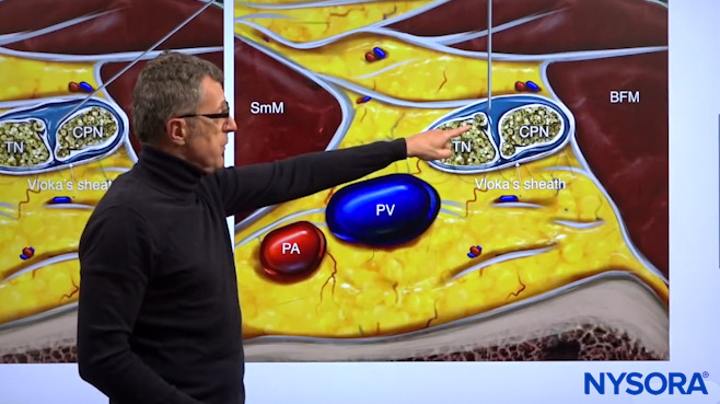 Dr. Hadzic showing the tibial nerve, the common peroneal nerve, and the popliteal artery in the popliteal vein and how the injection will take place in this space.