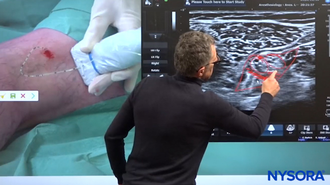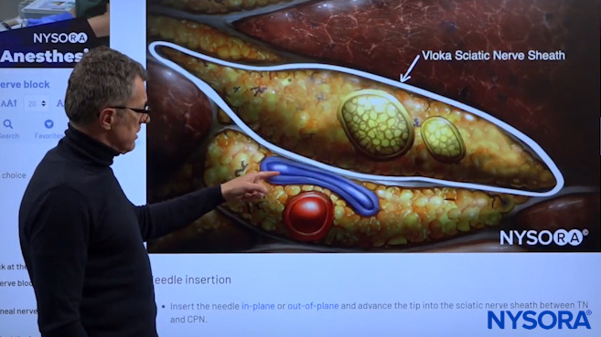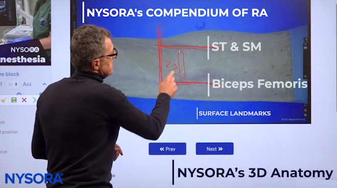 Dr. Hadzic using NYSORA’s 3D Anatomy cognitive aids to show the popliteal fossa space where we can see the two nerves, the tibial nerve, and common peroneal nerve, to inject the local anesthetic.