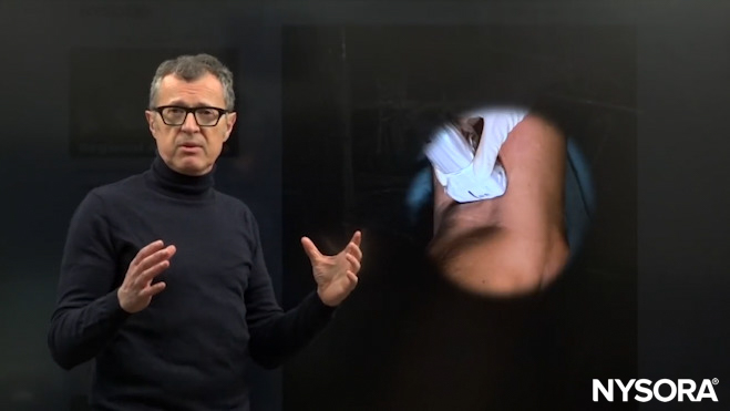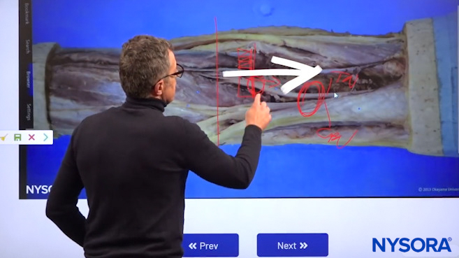 Dr. Hadzic using NYSORA’s 3D Anatomy cognitive aids to show the process of scanning proximally and distally in order to find “the sweet spot” where the injection should occur.