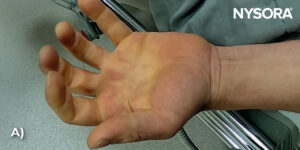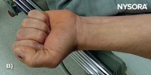Ask the patient to open (A) and close (B) the hand repeatedly to encourage blood flow into the veins and to facilitate vein recognition.
