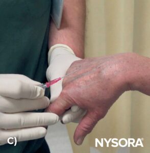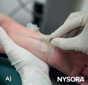 Paravenous insertion of the needle in a dorsal hand vein while maintaining a low angle to reduce the risk of puncturing the vein’s opposite wall.