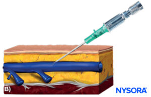 The most common or standard approach is the TOP approach, in which the needle is positioned and advanced directly over (above) the vein. However, a paravenous approach may sometimes be more appropriate.