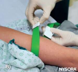 - Ensure the tourniquet lays flat against the skin and remains untwisted for optimal performance. A twisted tourniquet is less effective and uncomfortable for the patient.