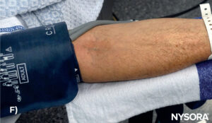 Several tourniquet designs are available. A) A tourniquet with a buckle system. B) A tourniquet with a magnetic closing. C) A rubber band used as a tourniquet. D) The use of two parallel rubber tourniquets to encourage blood flow to the superficial veins. E) A rubber band (Esmarch, 10-15 cm or 4-6 inches in width) wrapped around the upper arm and forearm to encourage blood flow to the superficial veins. F) Using a blood pressure cuff as a tourniquet during venipuncture. G) Smaller more distensible tourniquets are available for pediatric patients to prevent blocking the arterial blood flow.