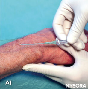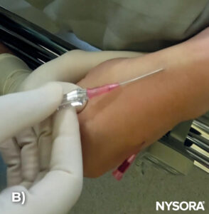 A) Needle insertion. B) Illustration of the needle insertion.