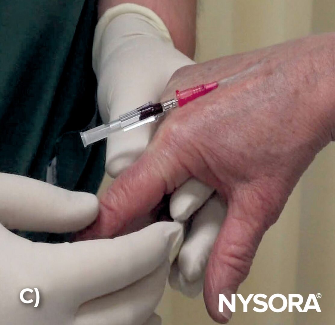 Paravenous insertion of the needle in a dorsal hand vein while maintaining a low angle to reduce the risk of puncturing the vein’s opposite wall.