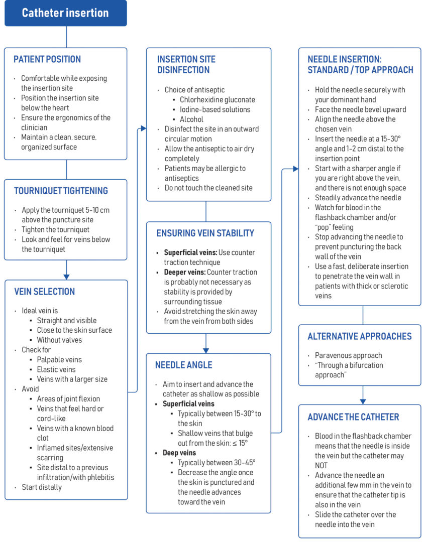 - Stop advancing the needle-catheter system once sufficiently inside the vein, as going too deep can lead to the needle tip puncturing the vein’s back wall and/or hematoma.