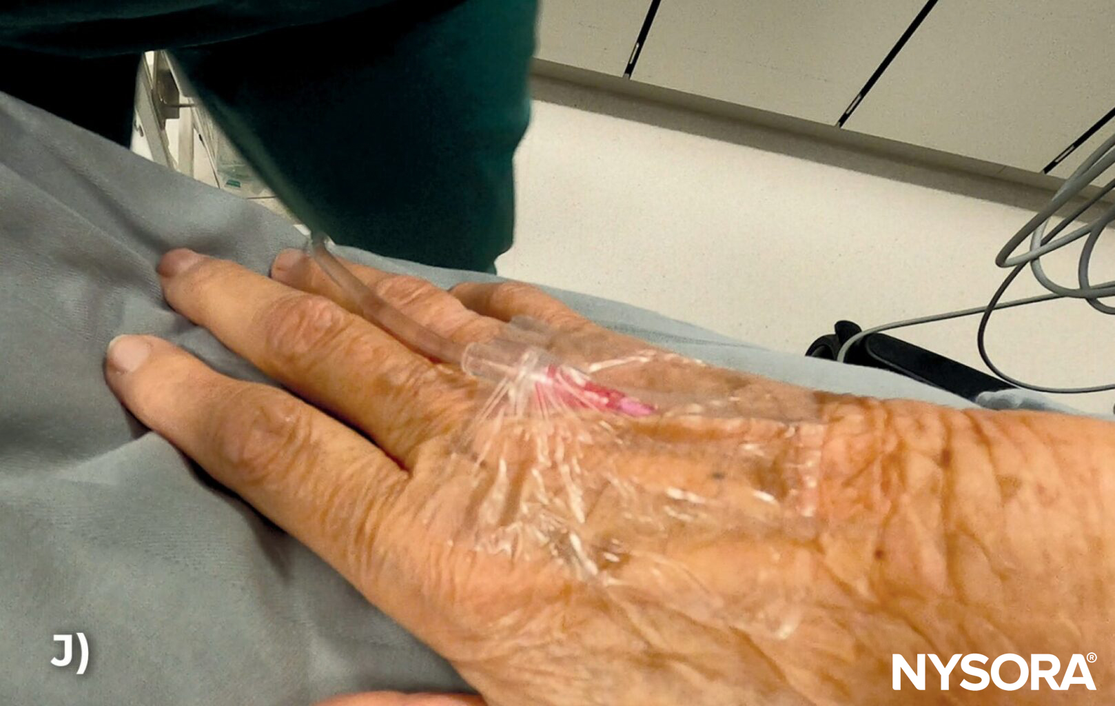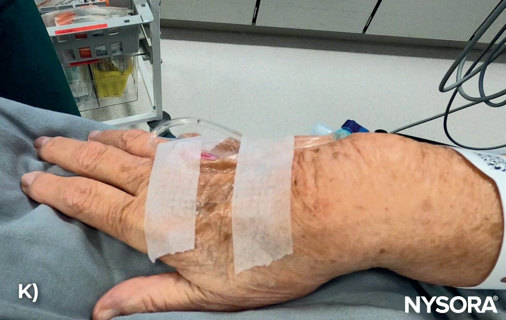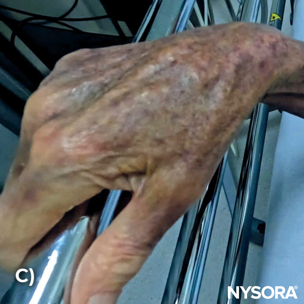 Step-by-step technique of IV cannulation in the hand of an elderly patient demonstrating the difficulties with frail veins