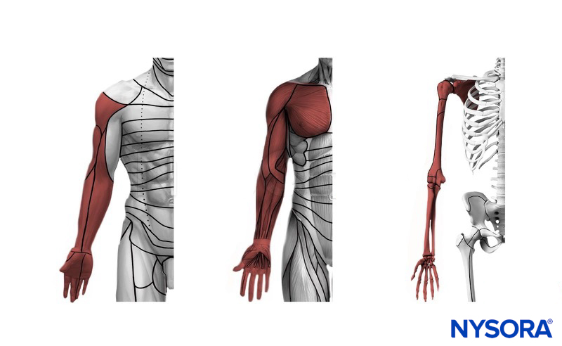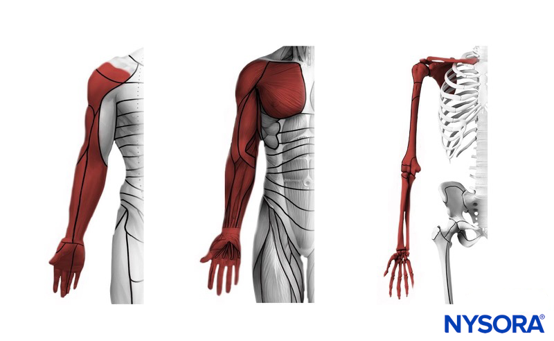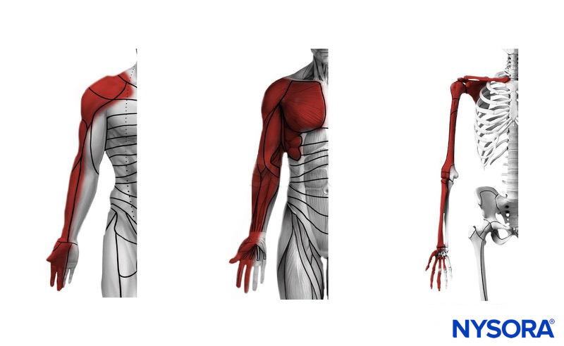 Cognitive aid: Anesthesia distribution with an axillary brachial plexus block. Left: dermatomes, middle: myotomes, right: osteotomes.
