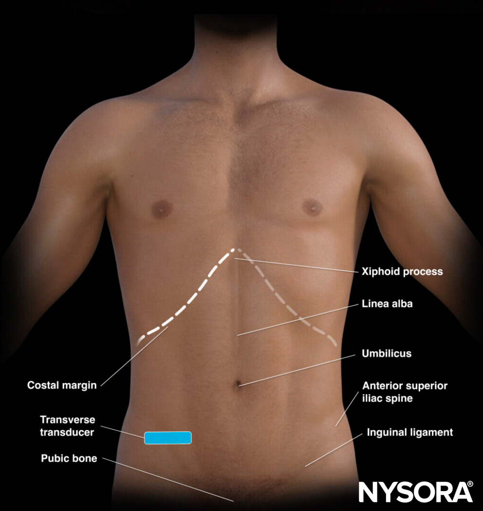 - Transducer: curvilinear (or a linear transducer in children or slim adults)