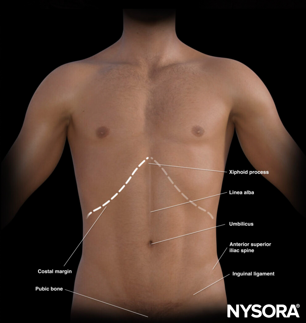 - Linea alba: midline of the abdomen that separates the rectus abdominis muscles and connects the xiphoid process with the pubic bone.