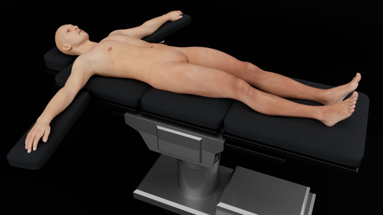 Position the patient supine and completely flat, with the arms abducted.