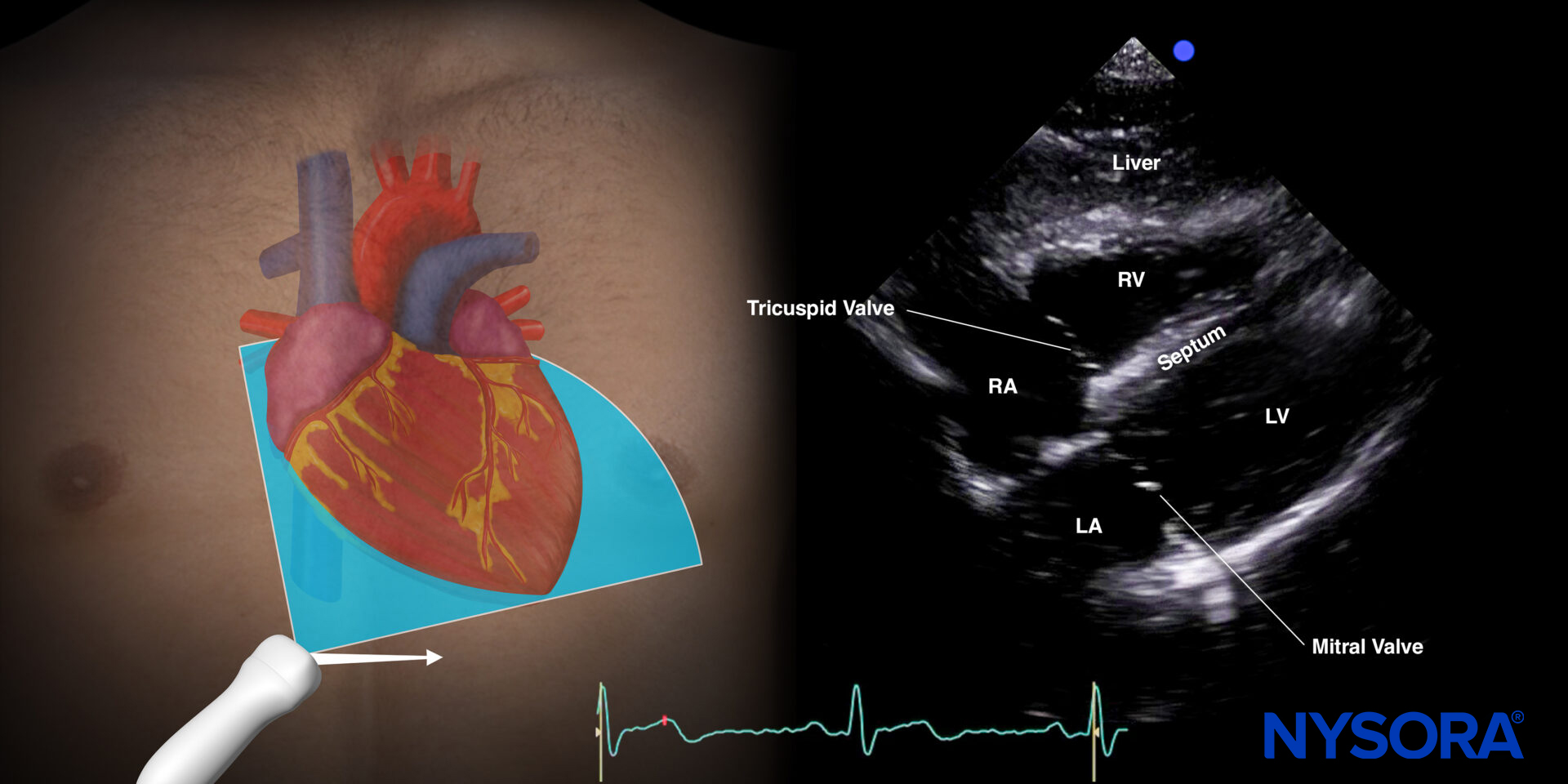 For this view, either a phased array transducer or a curvilinear transducer can be used.