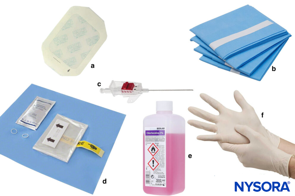 a, Tegaderm; b, Sterile draping; c, Cannula; d, Sterile ultrasound sleeve; e, Antiseptic; f, Sterile gloves.