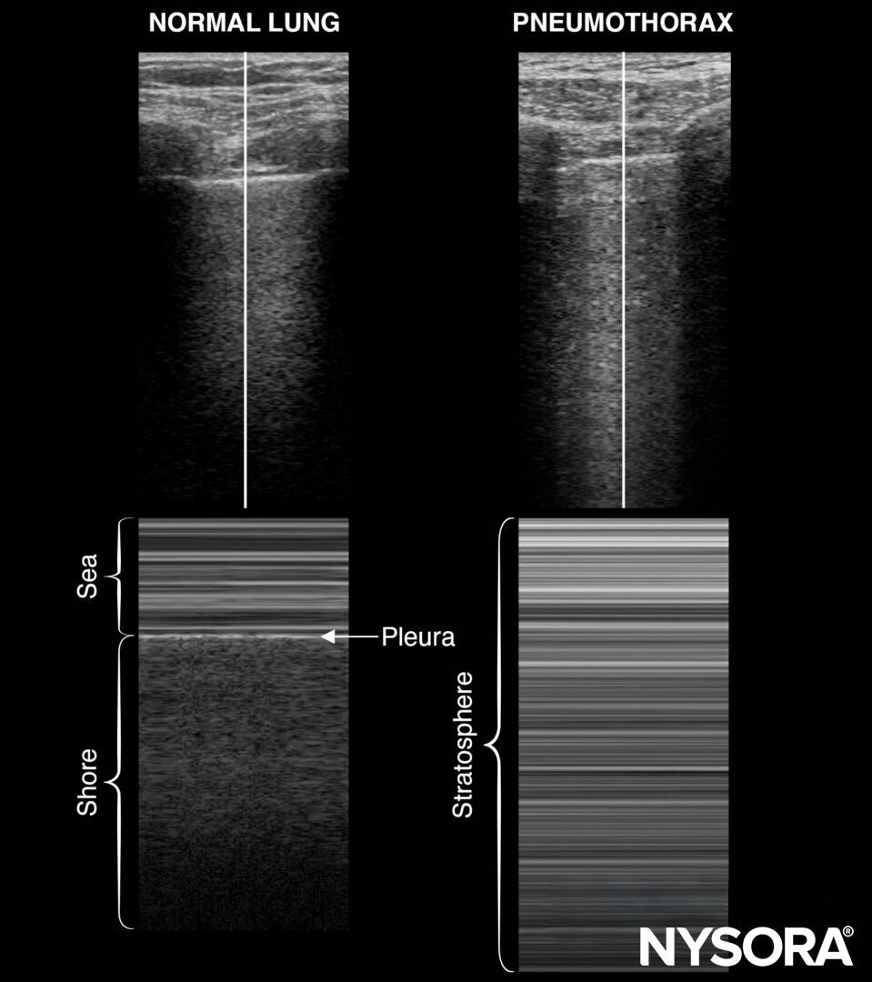 M-mode in normal lungs will show a seashore sign. Imagine the look of a sandy beach with the sea above. A pneumothorax will result in parallel horizontal white lines, also called the stratosphere sign.
