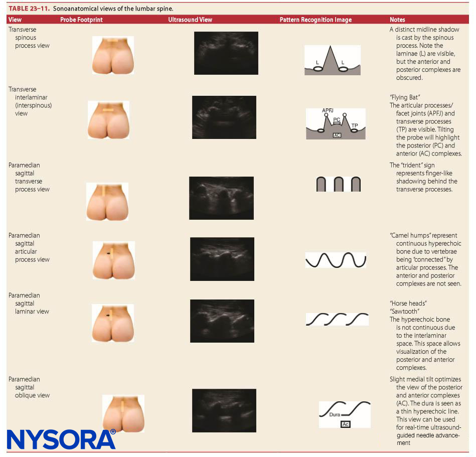 Additional views of the spine can be obtained by placing the probe in a paramedian sagittal orientation and sliding laterally through the paramedian laminar, articular process, and transverse process views. The paramedian oblique view is obtained by tilting the probe medially, aiming to highlight the posterior and anterior complexes through the interlaminar space. This view can be used for real-time ultrasound-guided spinal anesthesia.