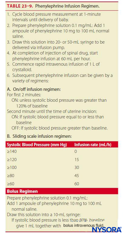 | Technique | • Be prepared to convert to general anesthesia. Prior to placement of a spinal anesthetic, the pregnant patient should receive 30 mL of 0.3 M sodium citrate orally to decrease stomach acidity. Equipment and drugs necessary to administer general anesthesia should be readily available. • After the spinal anesthetic is given, the patient should be in the supine position with left uterine displacement. Fetal heart rate should be monitored by Doppler or fetal scalp electrocardiogram (ECG). • A T4-level block is usually required for a cesarean section due to traction on the peritoneum and uterine exteriorization. • Some patients complain of dyspnea due to abdominal and intercostal motor block, but if the patient is able to speak clearly, reassurance and monitoring is usually all that is required. Sensory loss in the upper limb or inability to extend the forearm (C7/C8) should warn the clinician regarding impending diaphragmatic paralysis (C3/C4/C5). • If the mother wants to nurse the newborn, an assessment of upper limb strength should be made. Adequate staffing should allow someone other than the anesthesiologist to be responsible for the well-being of the newborn. • Hypotension and nausea are common, especially in the elective setting (see section on management of hypotension after spinal anesthesia). Prophylactic phenylephrine and “coloading” with fluid effectively prevents hypotension and nausea. Table 23–9 provides a suggested regimen for managing hypotension during elective cesarean section. |