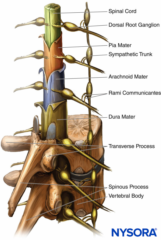 Spinal anesthesia is traditionally performed in the lumbar region below the level of the conus medullaris to avoid injury to the spinal cord. However, MRI images, albeit in a supine position, have shown that the mid- to lower thoracic segment of the cord lies anteriorly, such that there is a CSF-filled space between the dura and the cord (see Figure 17).